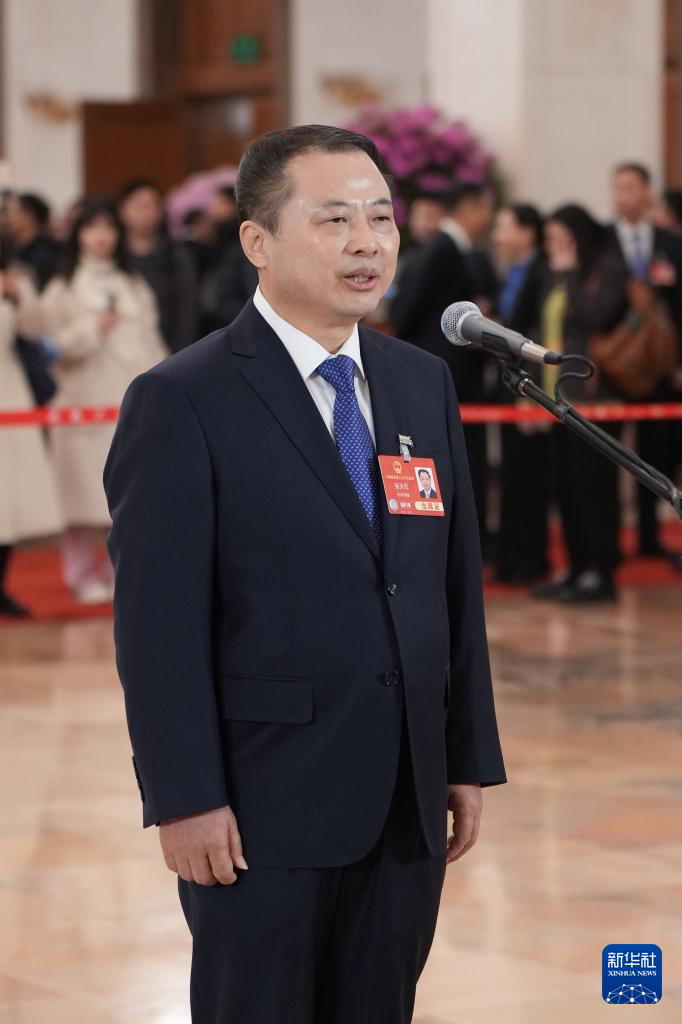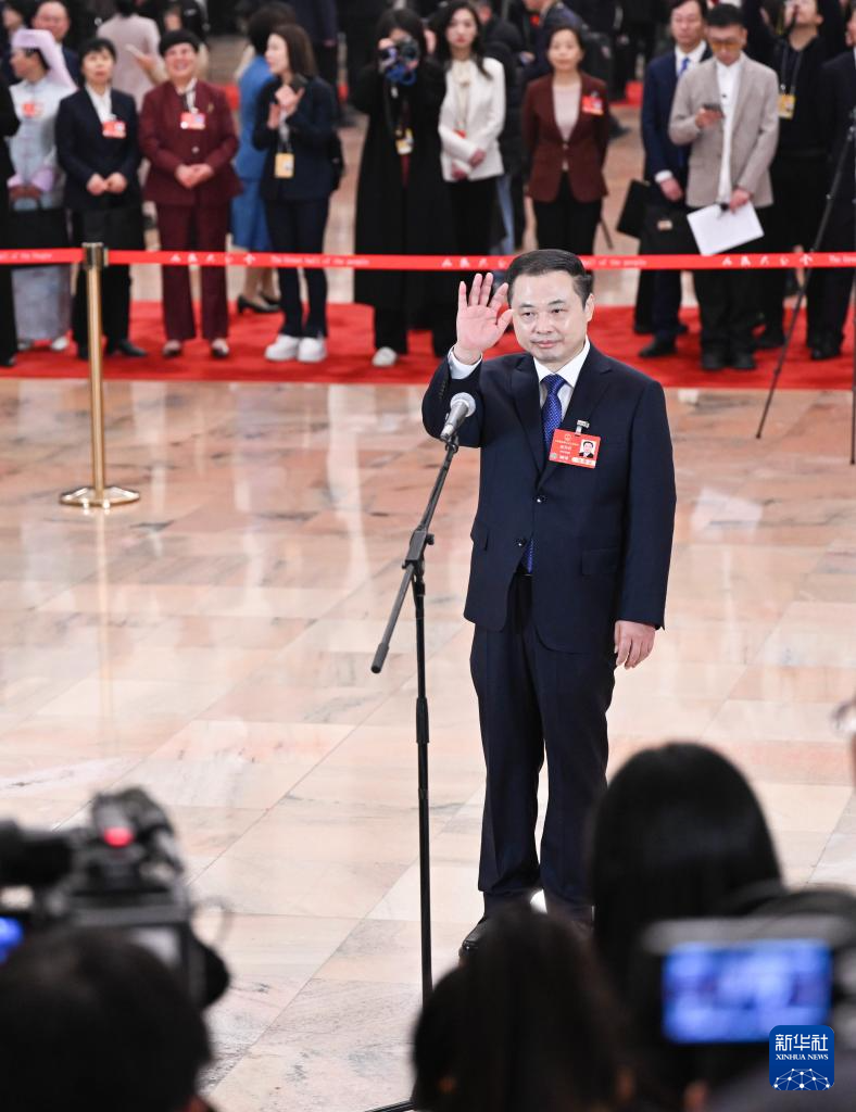 3月5日,第十四届全国人民代表大会第三次会议首场“代表通道”集中采访活动在北京人民大会堂举行。这是全国人大代表张天任接受媒体采访。新华社记者 王建华 摄