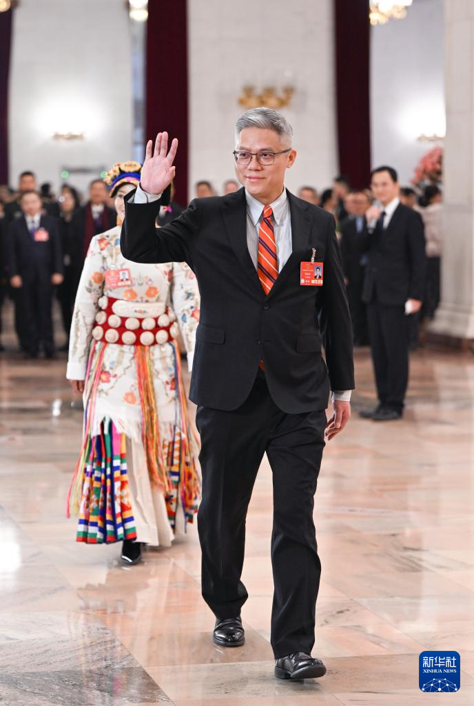 3月5日,第十四届全国人民代表大会第三次会议首场“代表通道”集中采访活动在北京人民大会堂举行。这是接受采访的全国人大代表入场。新华社记者 郑焕松 摄