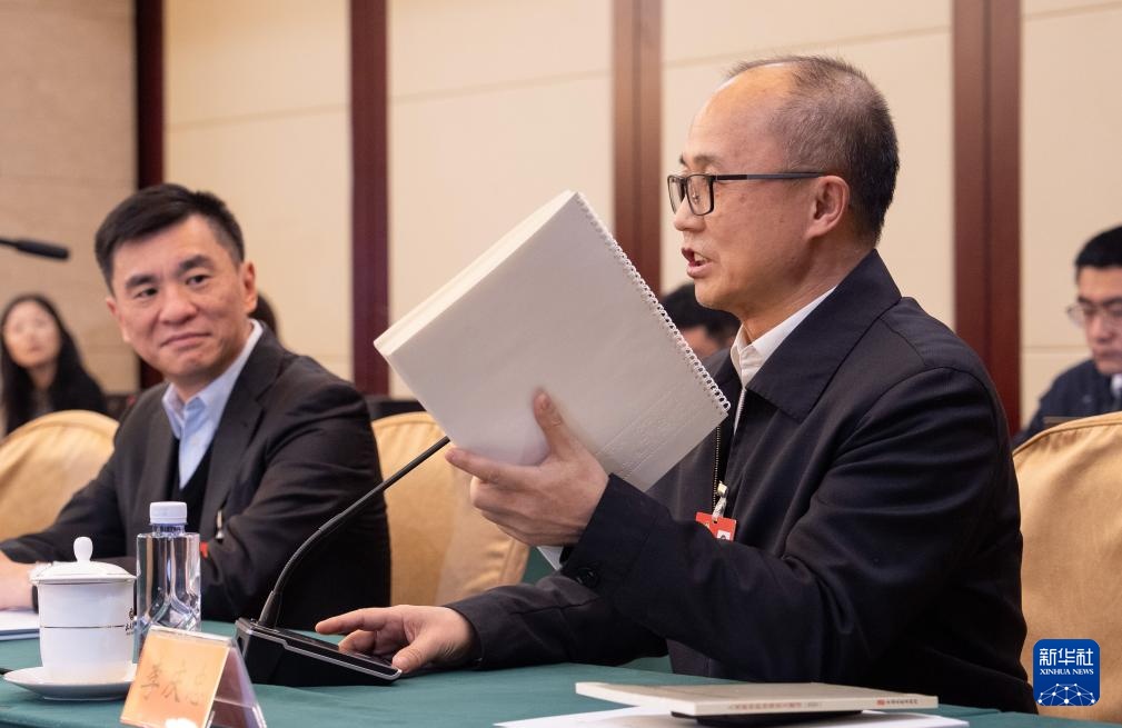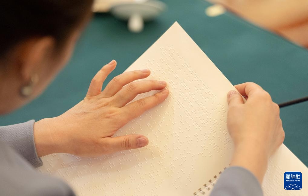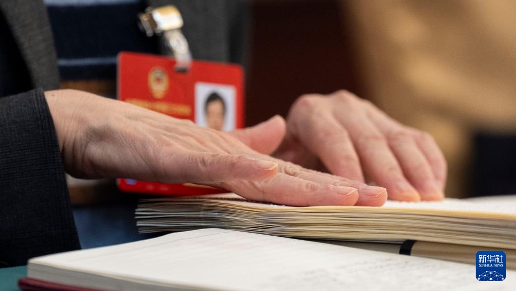 3月5日,在全国政协十四届三次会议社会福利和社会保障界别小组会议现场,政协委员触摸盲文版政府工作报告。新华社记者 才扬 摄