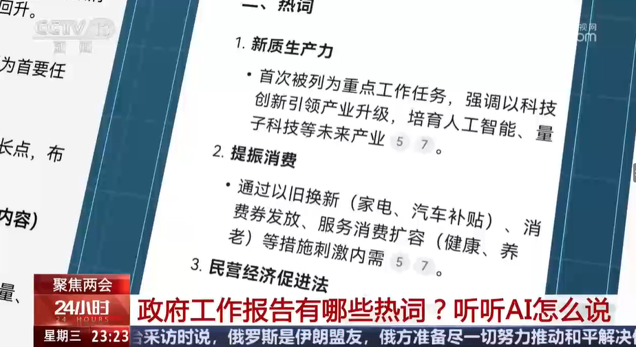 央视网消息:每年的政府工作报告中都有一些关注度高的热词,今年的政府工作报告中提到的“人工智能+”,给持续火爆的DeepSeek又添了一把火,政府工作报告里有哪些新词和高频词?网友们最关注什么?一起来听听AI怎么说。
