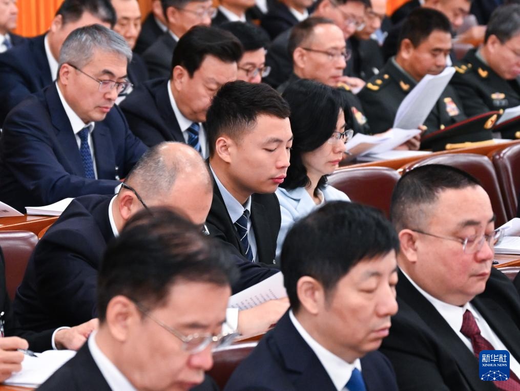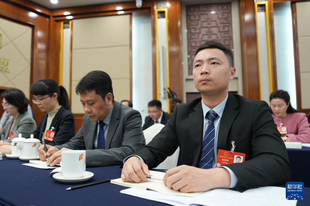 杨登辉(前右一)在十四届全国人大三次会议广东代表团全体会议上认真听取发言(3月6日摄)。新华社记者 刘大伟 摄