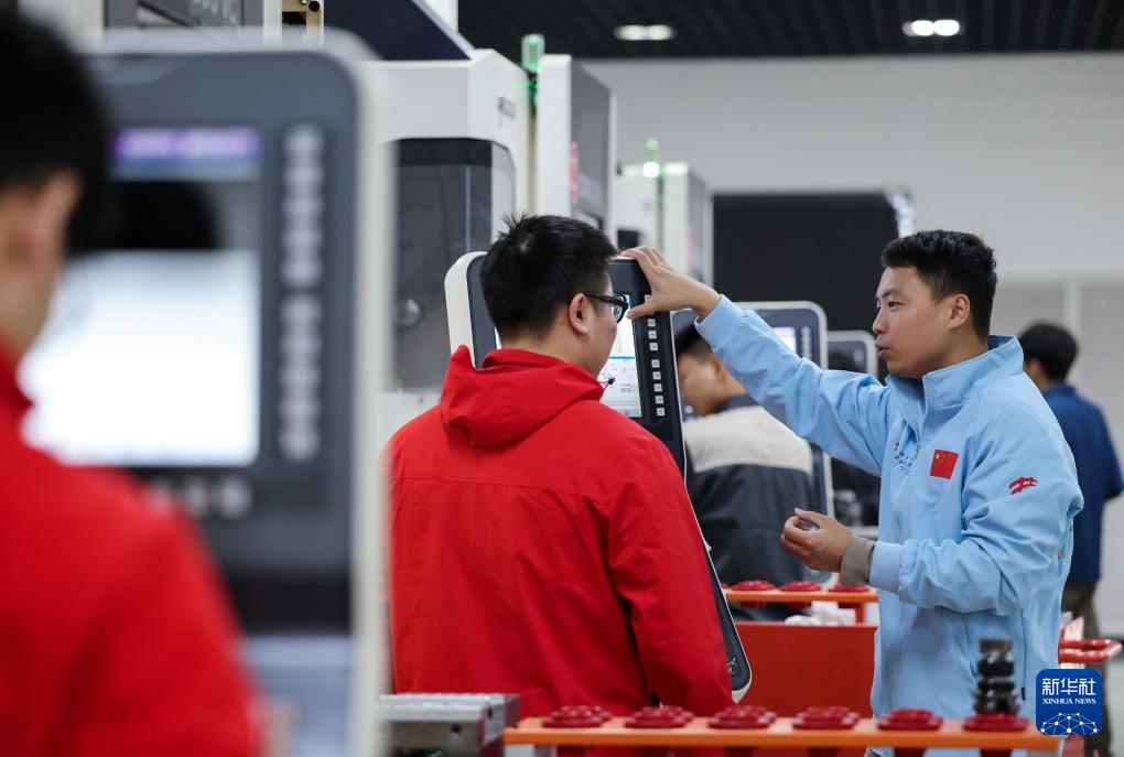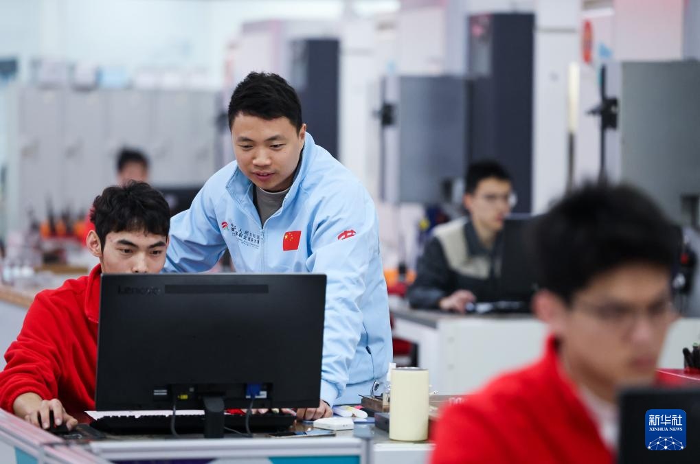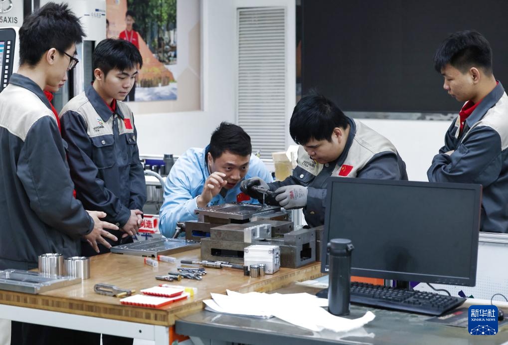 在广东省机械技师学院,杨登辉(中)指导学生提升器件加工精度(2月25日摄)。新华社记者 刘大伟 摄
