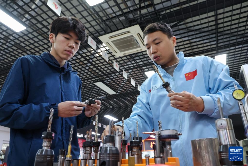 在广东省机械技师学院,杨登辉(右一)指导学生操作数控铣床(2月25日摄)。新华社记者 刘大伟 摄