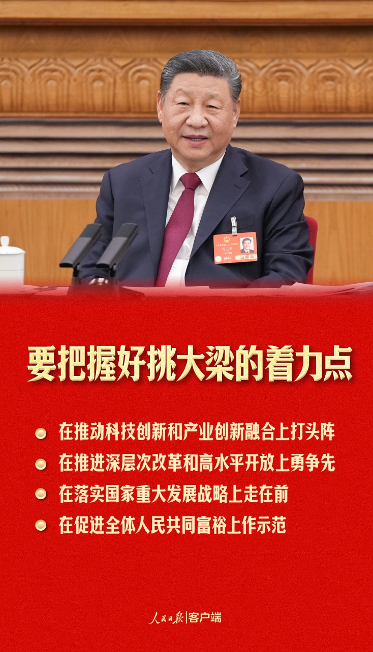 经济大省怎么挑大梁?这次参加江苏代表团审议,习近平总书记提出要把握好挑大梁的4个着力点:在推动科技创新和产业创新融合上打头阵,在推进深层次改革和高水平开放上勇争先,在落实国家重大发展战略上走在前,在促进全体人民共同富裕上作示范。