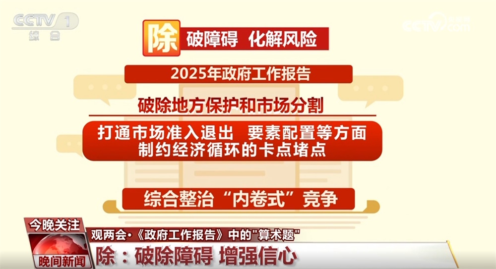 除破障碍,化解风险。报告提出,破除地方保护和市场分割;打通市场准入退出、要素配置等方面制约经济循环的卡点堵点,综合整治“内卷式”竞争。开展规范涉企执法专项行动。报告中一系列做好“除法题”的部署,展现政府呵护市场活力的决心,通过破除体制机制障碍、激发企业发展活力,政府和市场就能更好良性互动,经济发展也将迎来更多新机遇。