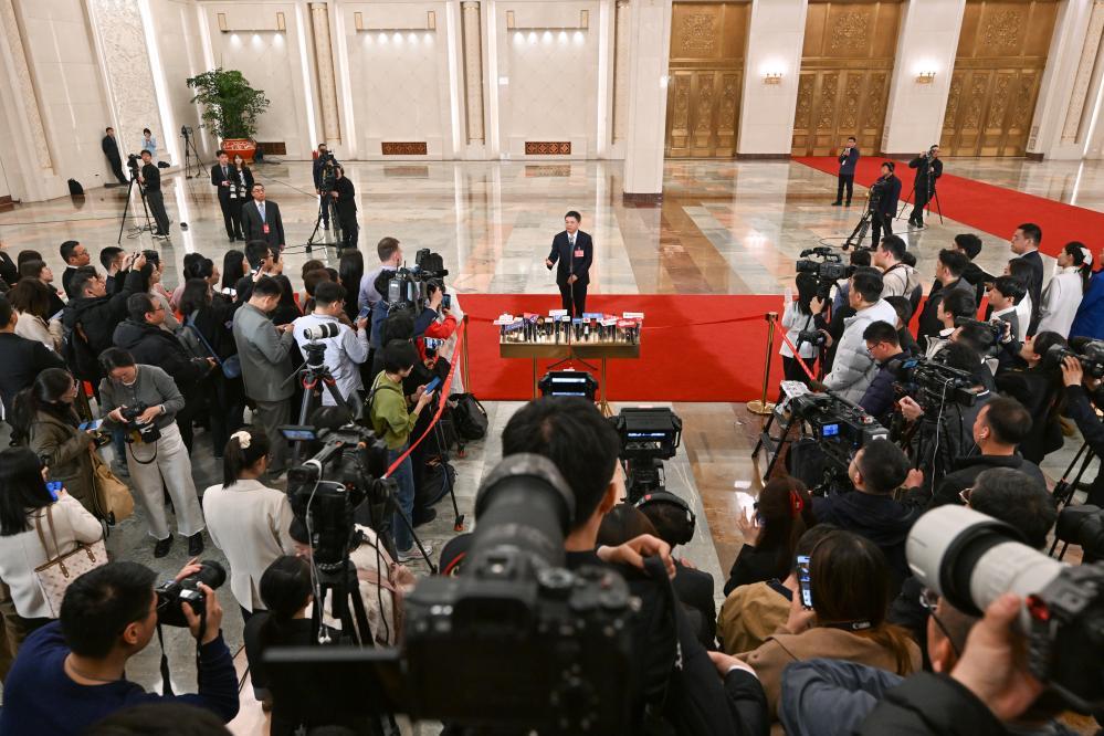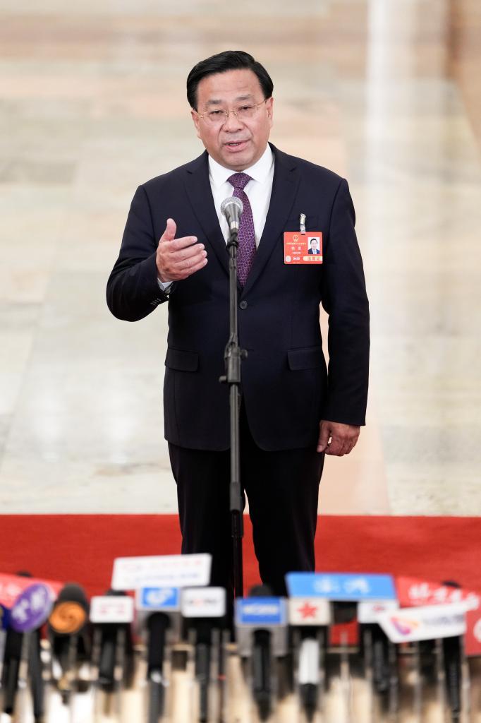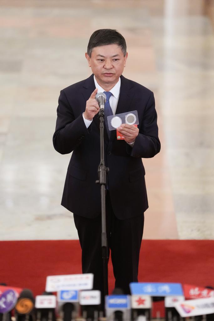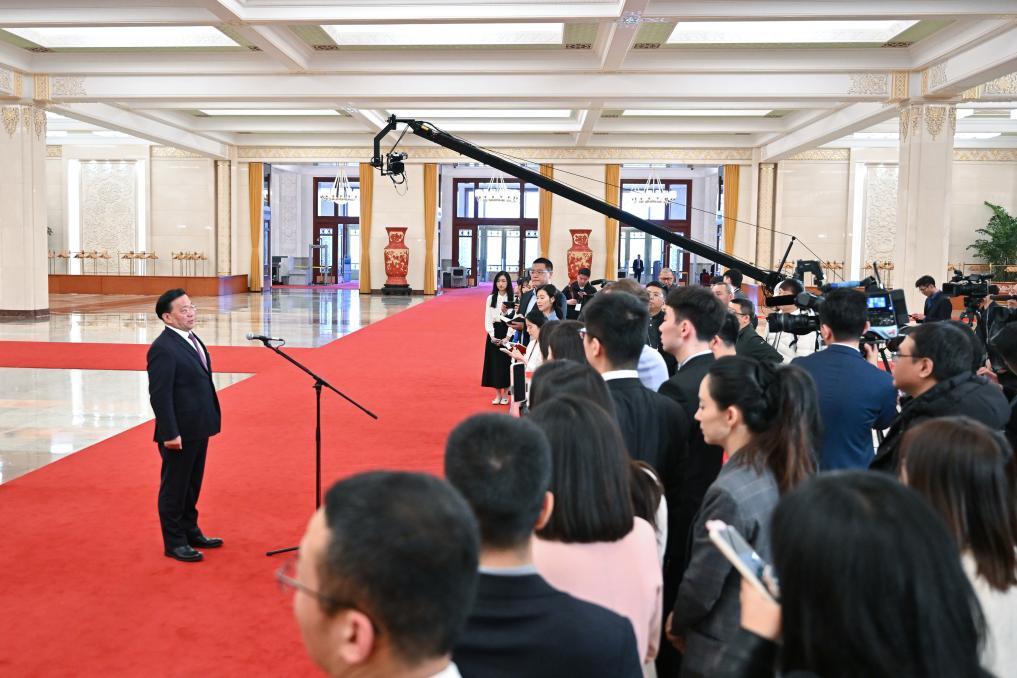 3月8日,第十四届全国人民代表大会第三次会议第二场“部长通道”集中采访活动在北京人民大会堂举行。这是水利部部长李国英接受媒体采访。新华社记者 胥冰洁 摄