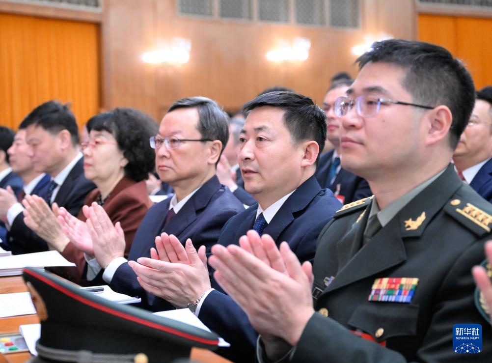 3月5日,全国人大代表、中石化第四建设有限公司工匠学院焊接教练张振连(右二)在北京人民大会堂出席十四届全国人大三次会议开幕会。新华社记者 申宏 摄