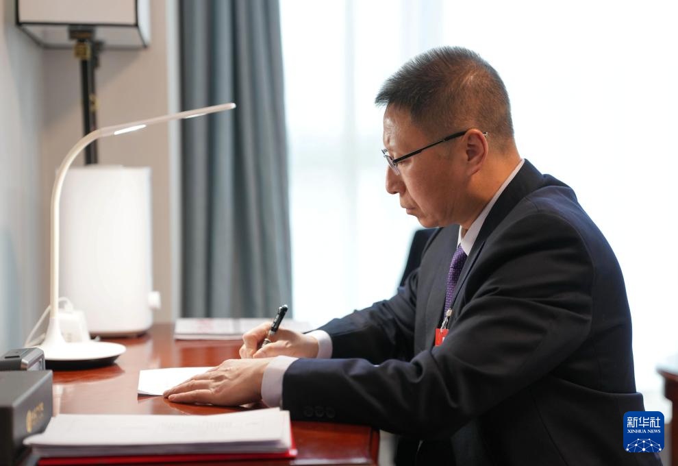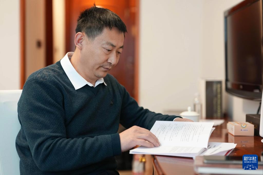 3月3日,全国人大代表、中石化第四建设有限公司工匠学院焊接教练张振连在北京的驻地阅读文件。新华社记者 邢广利 摄