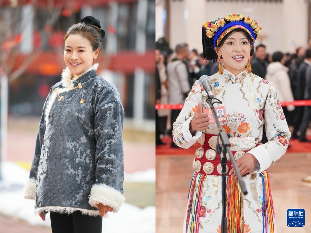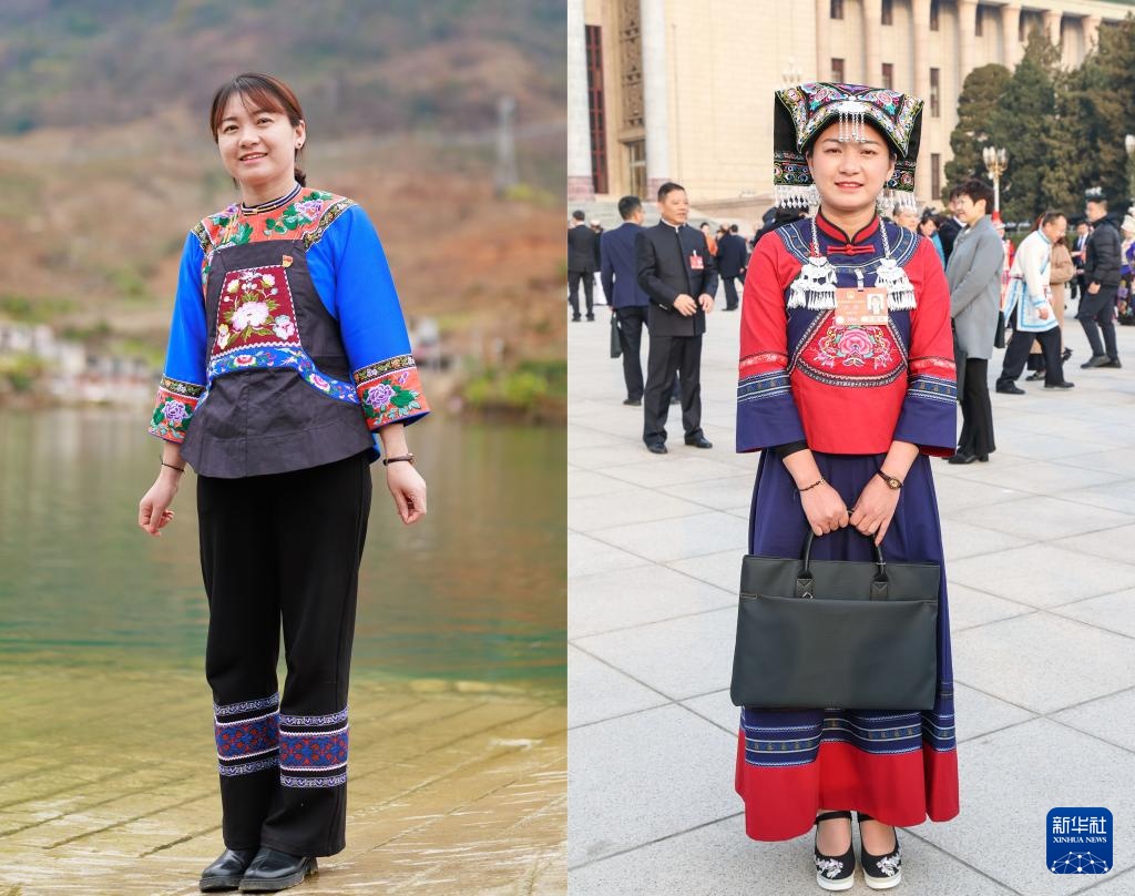 拼版照片:左图为在云南省南涧彝族自治县宝华镇拥政村拍摄的全国人大代表、南涧彝族自治县民族文化工作队队员鲁丽华(新华社记者陈欣波2025年2月7日摄);右图为在十四届全国人大三次会议云南代表团驻地拍摄的鲁丽华(新华社记者郑焕松2025年3月6日摄)。新华社发
