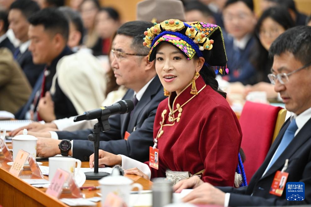 3月7日,全国人大代表、四川省阿坝藏族羌族自治州马尔康市老年养护院院长格西王姆在十四届全国人大三次会议四川代表团全体会议上发言。新华社记者 胥冰洁 摄