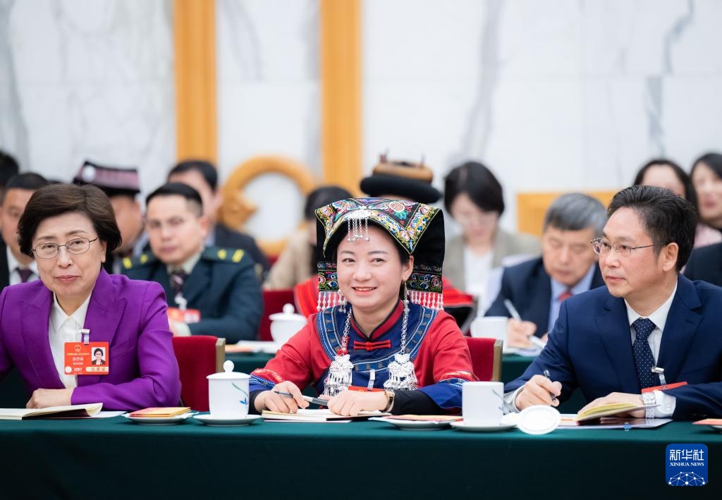3月5日,全国人大代表、贵州省安顺市镇宁布依族苗族自治县六马镇致富村党支部书记、村委会主任卢丹(中)在北京出席十四届全国人大三次会议贵州代表团全体会议。新华社记者 翟健岚 摄
