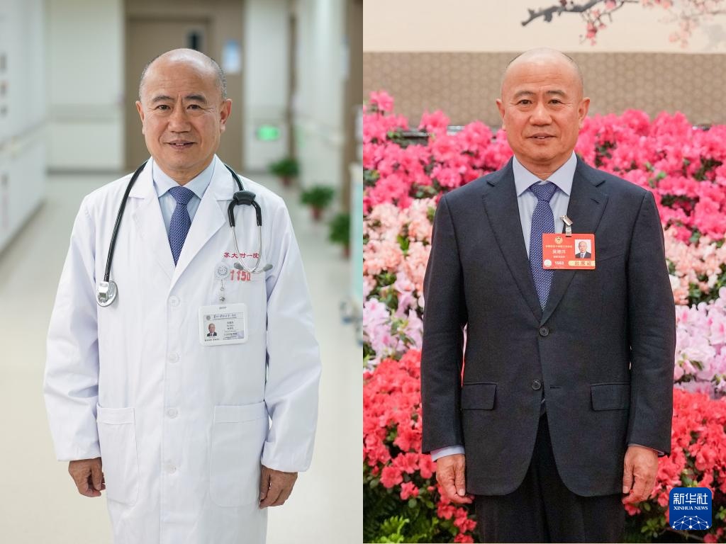 拼版照片:左图为在苏州大学附属第一医院拍摄的全国政协委员、苏州大学附属第一医院血液科主任吴德沛(新华社记者季春鹏2025年2月17日摄);右图为在北京人民大会堂拍摄的吴德沛(新华社记者周荻潇2025年3月4日摄)。新华社发