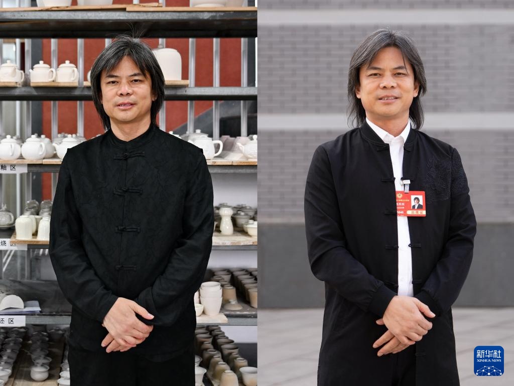 拼版照片:左图为在河北省曲阳县拍摄的全国政协委员、河北翰鼎雕塑集团首席技师高英坡(新华社记者牟宇2025年2月21日摄);右图为在北京的驻地拍摄的高英坡(新华社记者周荻潇2025年3月6日摄)。新华社发