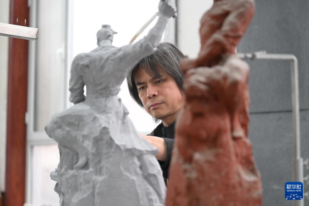 全国政协委员、河北翰鼎雕塑集团首席技师高英坡在河北省曲阳县的工作室进行雕塑创作(2025年2月21日摄)。新华社记者 牟宇 摄