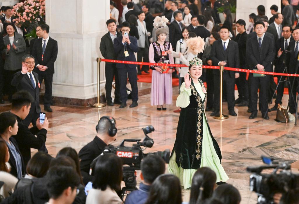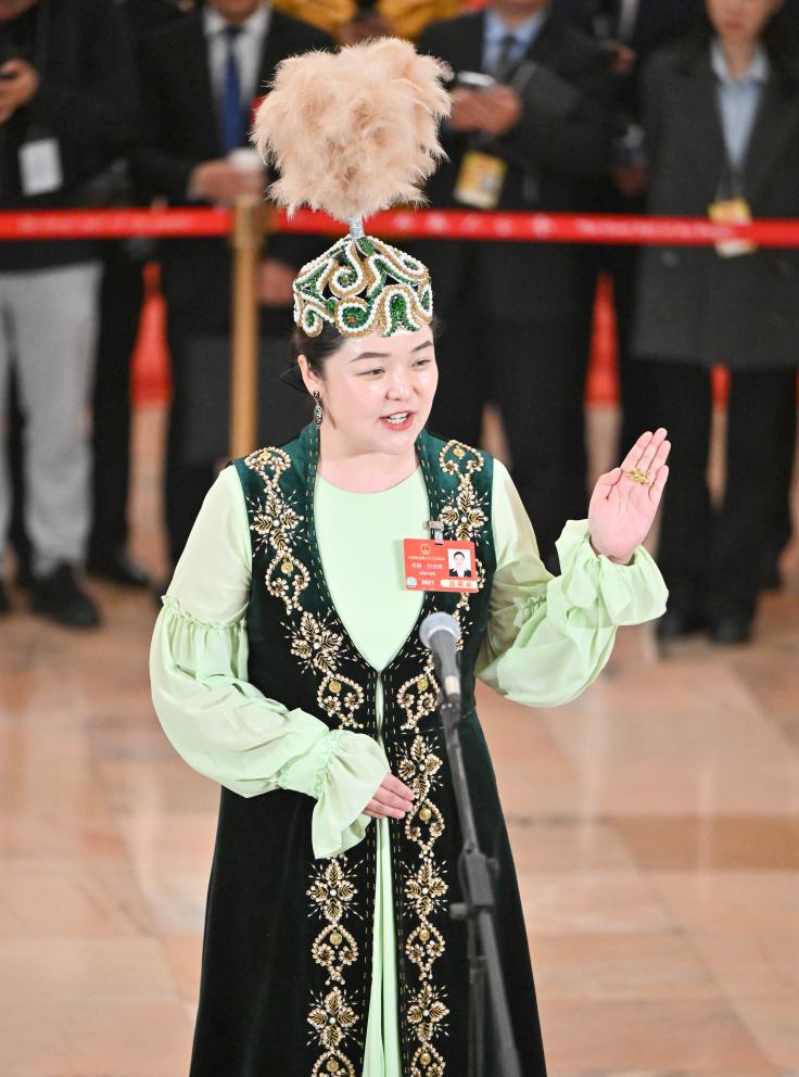 3月11日,第十四届全国人民代表大会第三次会议第三场“代表通道”集中采访活动在北京人民大会堂举行。这是全国人大代表卓娅·巴合提接受媒体采访。新华社记者 胥冰洁 摄