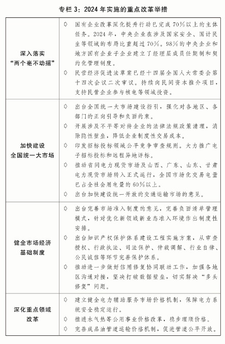 三是促进各种所有制经济优势互补、共同发展。高质量完成国有企业改革深化提升行动。实施国有经济布局优化和结构调整指引,完善国有企业分类、分行业考核评价体系,深入推进战略性重组和专业化整合。落实民营经济促进法,加快配套制度建设。进一步加大拖欠企业账款清偿力度,建立拖欠企业款项信用监管机制。开展加力帮扶小微企业纾困解难专项行动,用好支持小微企业融资协调工作机制。健全企业信用状况综合评价体系,提升融资信用服务平台质效。完善全国中小企业服务“一张网”,加强个体工商户分型分类精准帮扶。持续推动完善中国特色现代企业制度。