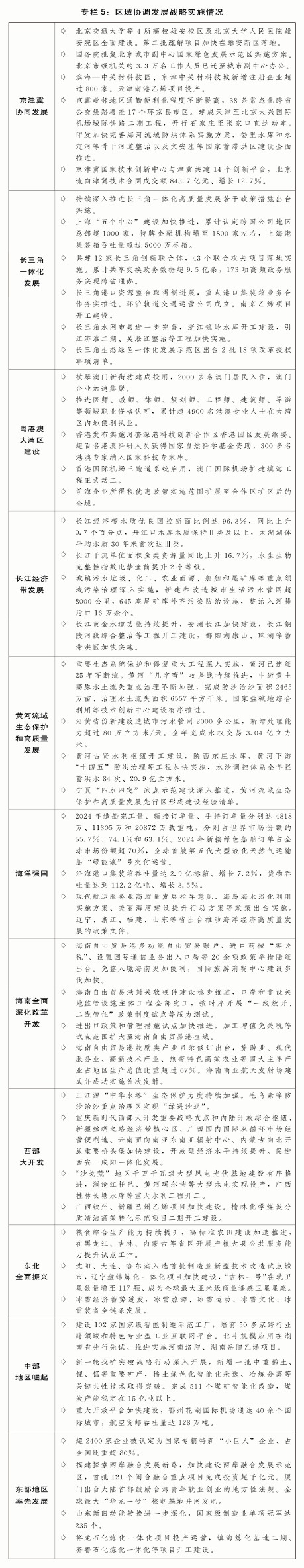 一是区域协调发展积厚成势。京津冀协同发展走深走实,在京相关高校、医院、中央企业总部及二三级子公司分批向雄安新区疏解,北京城市副中心行政办公、商务服务、文化旅游等功能不断完善,进一步支持天津滨海新区高质量发展若干政策措施出台实施,三省市互联互通交通网络更加完善、产业链上下游协作持续强化、公共服务共建共享水平进一步提升。长三角一体化高质量发展深入推进,生态绿色一体化发展示范区改革授权压茬推进,港口资源整合、轨道互联互通等取得新进展,上海“五个中心”建设进一步加快。粤港澳大湾区建设迈上新台阶,横琴粤澳深度合作区封关“一线”“二线”分线管理运行顺利,超1.6万名澳门居民在合作区居住生活,支持河套深港科技创新合作区深圳园区、香港园区联动发展,创新要素跨境流动更加便捷。长江经济带共抓大保护、不搞大开发成效显著,进一步抓实抓好长江大保护工作三年行动计划出台实施,长江十年禁渔取得明显成效,长江干流连续5年保持Ⅱ类水质,综合立体交通走廊加快构建,沿江高铁全线开工建设。黄河流域生态保护和高质量发展迈出坚实步伐,农业面源、城镇生活、工业和尾矿库污染治理深入推进,8万余个入河排污口开展溯源整治,一批生态保护修复重点项目加快建设,黄河干流连续3年保持Ⅱ类水质。海洋强国建设深入推进,海洋强省、现代海洋城市、全国海洋经济发展示范区创新发展,海洋生态环境质量持续改善,海洋生产总值超10万亿元。