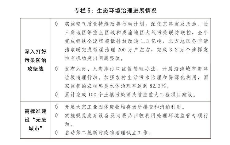 一是生态环境质量持续改善。深入打好蓝天、碧水、净土保卫战,全国地级及以上城市细颗粒物(PM2.5)平均浓度为29.3微克/立方米、下降2.7%,空气质量优良天数比率为87.2%;地表水质量达到或好于Ⅲ类水体比例为90.4%,城市生活污水集中收集率76.6%;化学需氧量排放量、氨氮排放量、挥发性有机物排放量、氮氧化物排放量持续下降。印发土壤污染源头防控行动计划。深入实施环境基础设施建设水平提升行动,强化塑料污染和过度包装全链条治理,深入推进快递包装绿色转型。