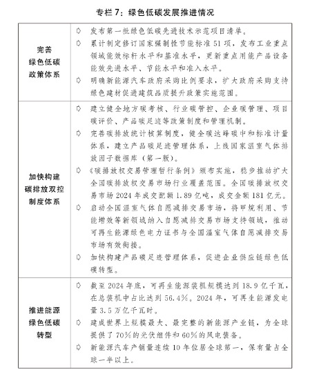 三是加快推动绿色低碳发展。持续构建碳排放双控制度体系,制定出台碳达峰碳中和综合评价考核办法,建立健全碳排放统计核算制度、碳排放预算管理制度、产品碳足迹管理体系、产品碳标识认证制度,丰富完善国家温室气体排放因子数据库。推动全国碳排放权交易市场、温室气体自愿减排交易市场、绿色电力证书市场建设。发布第二批绿色低碳先进技术示范项目清单,扎实开展第二批国家碳达峰试点,出台零碳园区建设方案。延长碳减排支持工具实施年限至2027年,有序推进碳金融产品和衍生工具创新,发展绿色保险。有力有效管控高耗能高排放项目,加快推动重点领域节能降碳改造和用能设备更新,加强重点用能单位节能管理,完善节能降碳标准体系,深入实施能效标识制度。健全资源环境要素市场化配置体系。营造绿色低碳产业健康发展生态,培育绿色建筑、绿色能源、绿色交通等新增长点。加强煤炭绿色智能开发、清洁高效利用。统筹新能源开发与消纳,有力有序推进集中式和分布式新能源健康发展,加快“沙戈荒”新能源基地建设,有序开发建设海上风电基地,统筹就地消纳和外送通道建设。大力实施可再生能源替代行动。推进煤电低碳化改造示范。进一步规范新型储能并网管理,持续完善调度机制。实施全面节约战略,持续推动“能水粮地矿材”一体化节约,深入实施国家节水行动。大力发展循环经济,加强废弃物循环利用,推广再生材料使用。