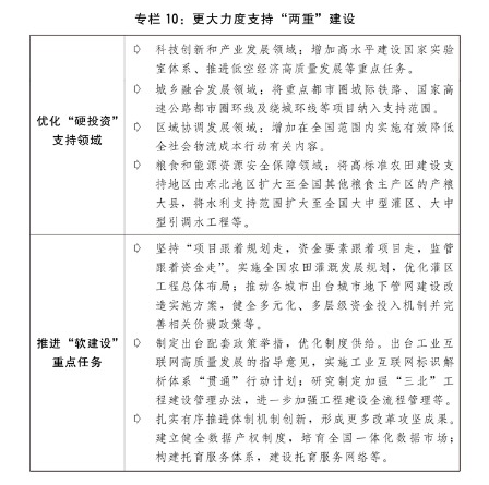 三是加力推进“两重”建设。进一步完善自上而下的工作机制,加强“两重”建设项目储备,更好统筹“硬投资”与“软建设”。安排超长期特别国债8000亿元支持“两重”建设,进一步优化具体投向并提高项目支持比例,重点支持基础研究能力提升、未来产业发展、东北等重点地区高标准农田建设、大中型灌区新建改造及大中型引调水和大中型水库建设、长江经济带生态环境保护和绿色发展、农业转移人口市民化公共服务体系建设、高等教育提质升级、城市地下管网管廊建设改造等方面任务,强化超长期贷款等配套融资,高质量推进“硬投资”项目谋划实施。加大力度推动“软建设”政策落地见效。