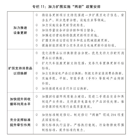 四是加力扩围实施“两新”政策。安排超长期特别国债5000亿元支持大规模设备更新和消费品以旧换新,统筹投资、财政、金融等综合性政策,深入推进设备更新、消费品以旧换新、回收循环利用、标准提升四大行动。进一步加大重点领域设备更新项目支持力度,加力实施设备更新贷款贴息,加快存量设备评估诊断和项目储备。进一步支持消费品以旧换新,扩大汽车报废更新支持范围,完善汽车置换更新补贴标准,实施手机、平板等数码产品购新补贴,积极支持家装消费品换新,简化补贴申领和支付流程,完善资金监管机制,严厉打击价格欺诈和违规骗补套补行为。