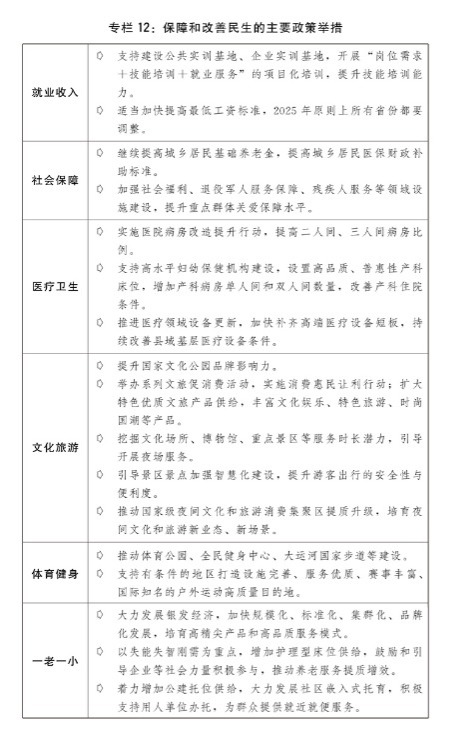 一是实施提振消费专项行动。制定提升消费能力、增加优质供给、改善消费环境政策举措,稳定大宗消费、扩大服务消费、拓展新型消费、合理增加公共消费,推动消费提质升级。多渠道促进居民增收,推动中低收入群体增收减负,完善劳动者工资正常增长机制。因城施策调减房地产消费限制性措施,推动建设安全、舒适、绿色、智慧的“好房子”,更好满足人民群众刚性和改善性住房需求、高品质居住需要。进一步优化汽车限购管理政策,加快构建充电基础设施体系,开展汽车流通消费改革试点。加快拓展文化、旅游、体育、健康、养老、托幼、家政、数字等服务消费,实施服务消费提质惠民活动、“百城百区”文化和旅游消费行动计划。加快培育带动性广、显示度高的消费新场景,支持影视游戏创作与中华优秀传统文化、特色旅游资源相结合等融合式沉浸式消费新场景发展。积极发展首发经济、冰雪经济、银发经济。完善游艇、房车露营等新型消费领域管理机制和行业标准,促进“人工智能+消费”,优化消费新业态新领域市场准入环境,加快推动各类新技术应用推广并向消费级产品转化。清理对消费的不合理限制。深入实施优化消费环境三年行动,加强消费信用体系和质量标准体系建设,规范网络销售、直播带货领域不合理经营行为,强化消费者权益保护。落实和优化带薪年休假制度。完善外国人入境居留政策和免税店政策,推动扩大入境消费。深化国际消费中心城市建设。