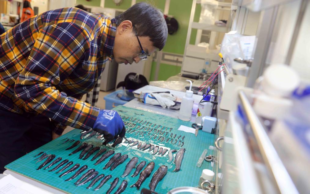 海蜘蛛、海参、海鞘……“雪龙2”号船载实验室内,考察队员牟剑锋正在清点刚打捞上来的底栖动物样品。