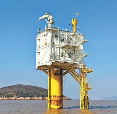 该项目由中国长江三峡集团有限公司投资建设,项目负责人陆忠民带着记者乘船近距离观察海上发电设备。下方由醒目黄色嵌岩钢管桩做基础支撑,上方升压平台好似白色集装箱,内部配有电气设备、提升系统、备用电源及火警系统等,潮流能发电机组则藏于海中,“我们的一大亮点是提升系统,可将机组提升出水面,方便开展现场检修维护。”陆忠民说。