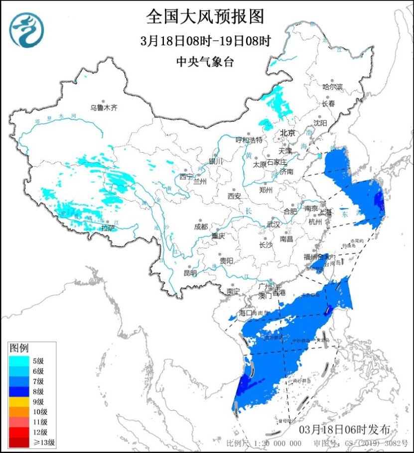预计,3月18日08时至19日08时,内蒙古中部、河北西北部、青海西部、西藏西部等地有5~6级风,阵风7~8级;黄海东南部海域、东海东北部海域、台湾海峡、台湾以东洋面、巴士海峡、南海大部海域将有7~8级、阵风9级的大风,中央气象台3月18日06时继续发布大风蓝色预警。