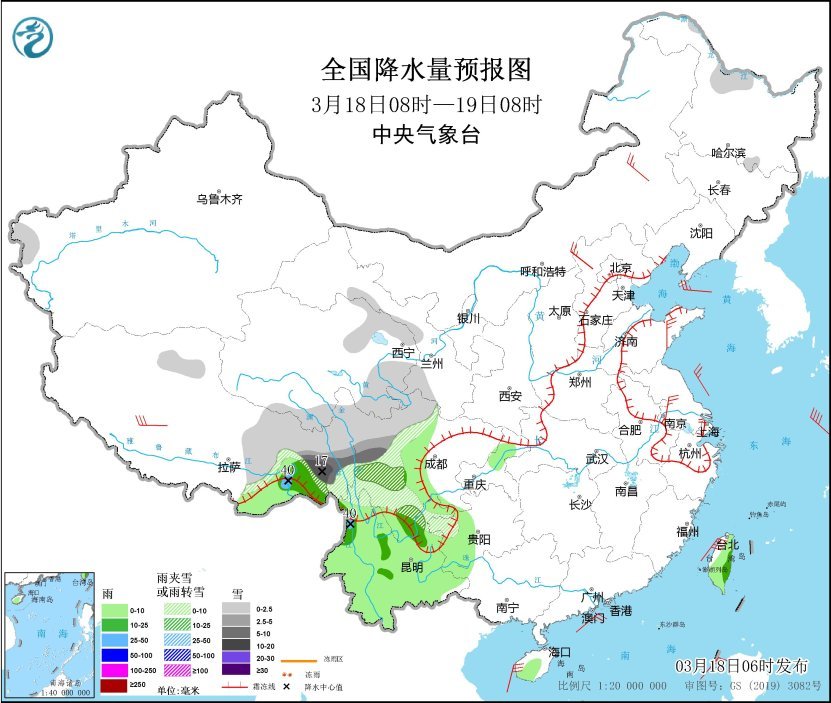 3月18日08时至19日08时,西藏东部、青海东部和南部、甘肃西南部、川西高原、贵州西北部、黑龙江北部等地部分地区有小到中雪或雨夹雪,其中,西藏东部、川西高原等地部分地区有大雪,局地暴雪(10~17毫米)。西藏东南部、四川盆地西部、云南大部、重庆北部、贵州西部、广西西北部、海南岛南部、台湾岛等地部分地区有小雨,其中,西藏东南部、云南西北部、台湾岛东部等地部分地区有中雨,局地有大雨(25~40毫米)。内蒙古中部、河北西北部、西藏西部等地部分地区有4~6级风;黄海东南部海域、东海东北部海域、台湾海峡、台湾以东洋面、巴士海峡、南海大部海域将有7~8级风。