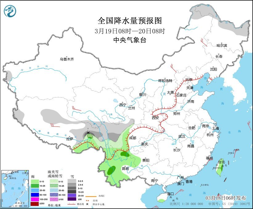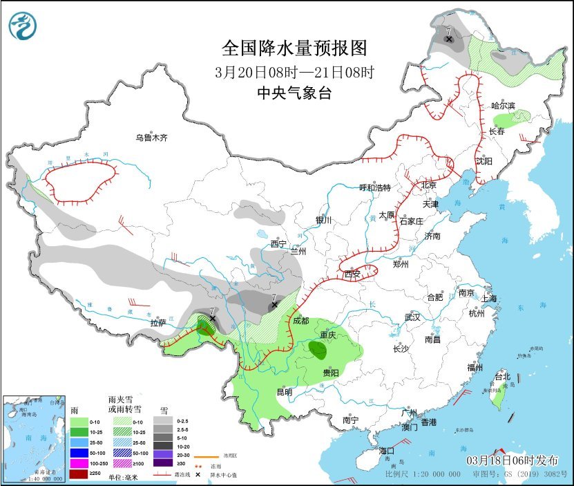 全国降水量预报图(3月19日08时-20日08时)