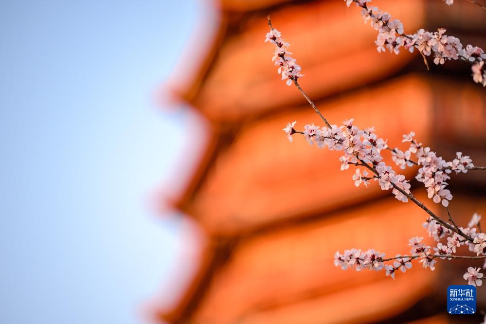 3月16日,北京园博园盛放的山桃花与永定塔相映成趣。新华社记者 张铖 摄