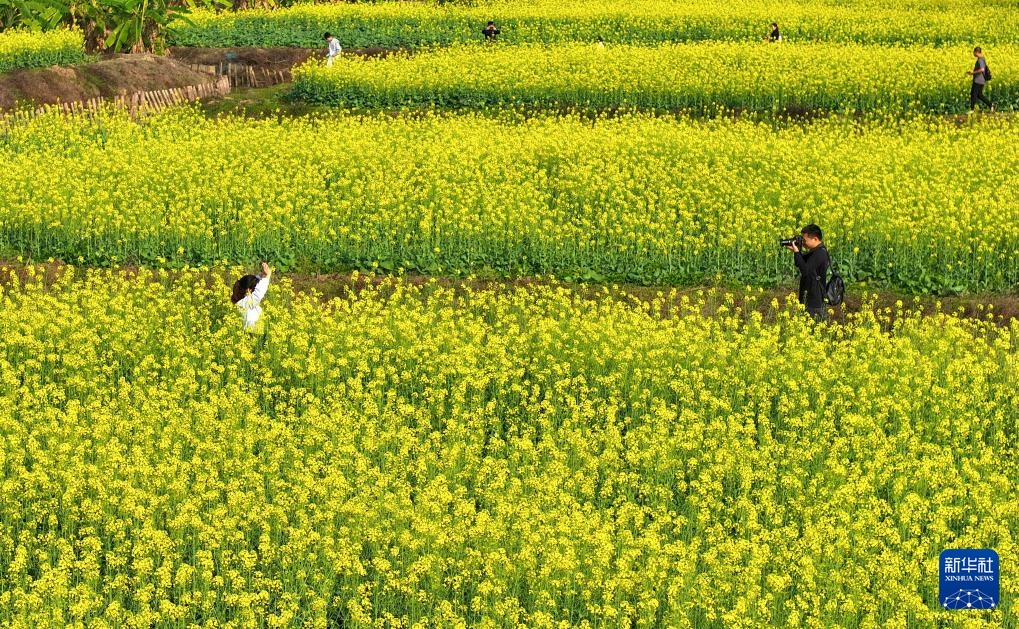 3月16日,游客在广西南宁市江南区江西镇的油菜花田游玩(无人机照片)。新华社记者 周华 摄