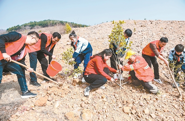 日前,含山县陶厂镇西塔山,安徽师范大学附属含山实验学校的党员和少先队员们一起植树。