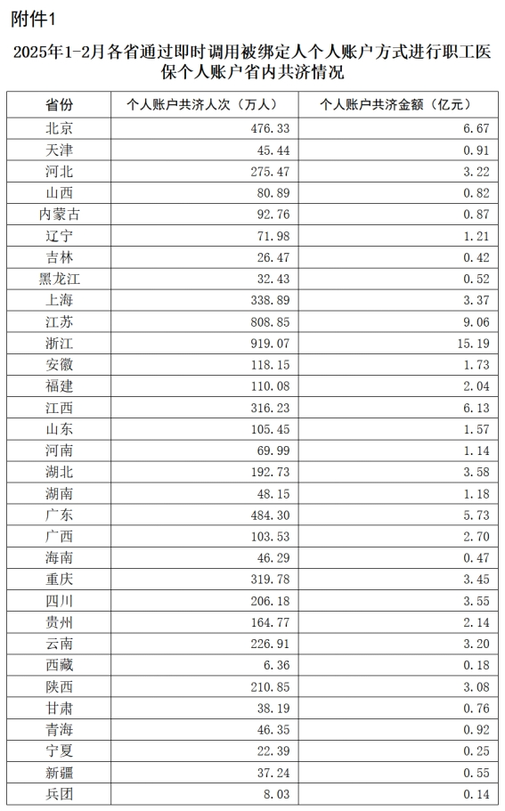 2025年1-2月,通过即时调用被绑定人个人账户方式进行职工医保个人账户省内共济的人次6050.51万,共济金额86.75亿元。