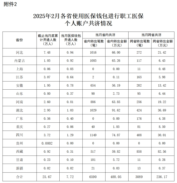 2025年2月,通过医保钱包转账方式进行职工医保个人账户省内、跨省共济共9679笔,转账金额724.22万元。从共济地域看,省内转账6590笔,转账金额488.05万元;跨省转账3089笔,转账金额236.17万元。从医保钱包使用用途看,支付就医购药费用总计2916笔,金额53.67万元;缴纳居民医保费用总计19笔,金额8506元。