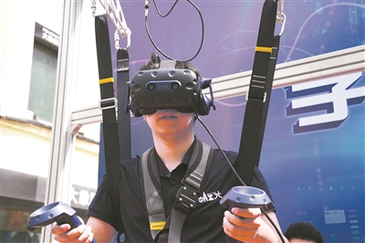 在哈尔滨工业大学学生创新创业成果展现场,参展团队成员展示沉浸式微低重力体验系统。新华社记者 王松摄