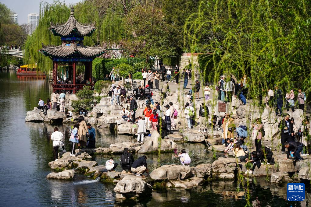 游人在济南护城河畔白石泉游玩(2024年4月5日摄)。新华社记者 朱峥 摄