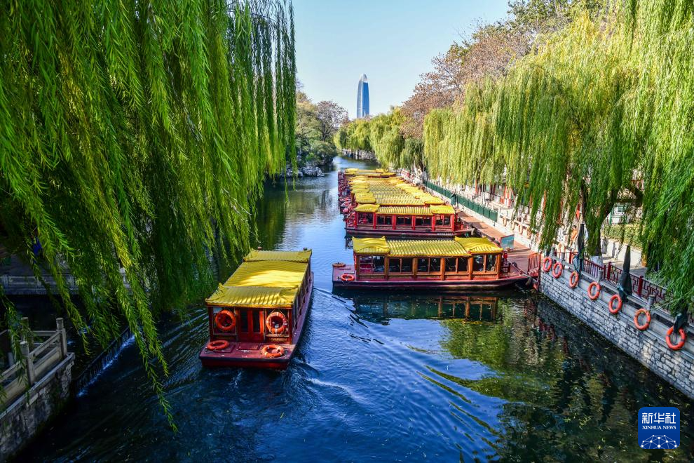 游船行驶在泉水汇集而成的济南护城河(2024年12月7日摄)。新华社记者 朱峥 摄