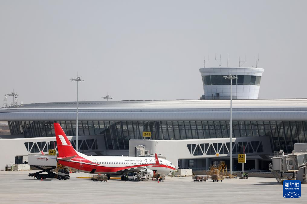 3月20日,一架航班停靠在兰州中川国际机场T3航站楼。新华社记者 陈斌 摄