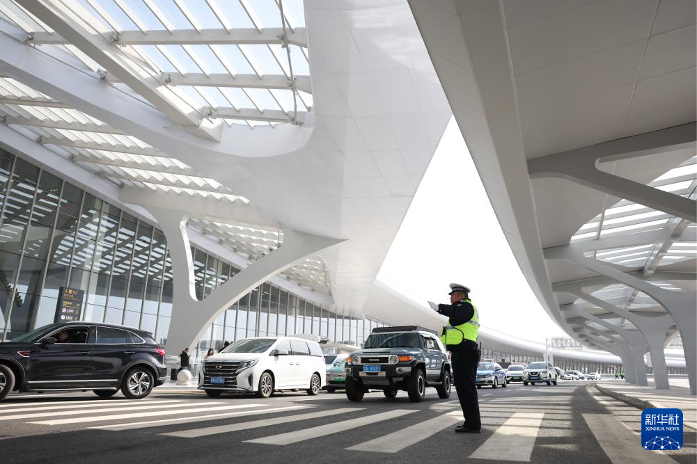 3月20日,交警在兰州中川国际机场T3航站楼落客区域指挥交通。新华社记者 陈斌 摄