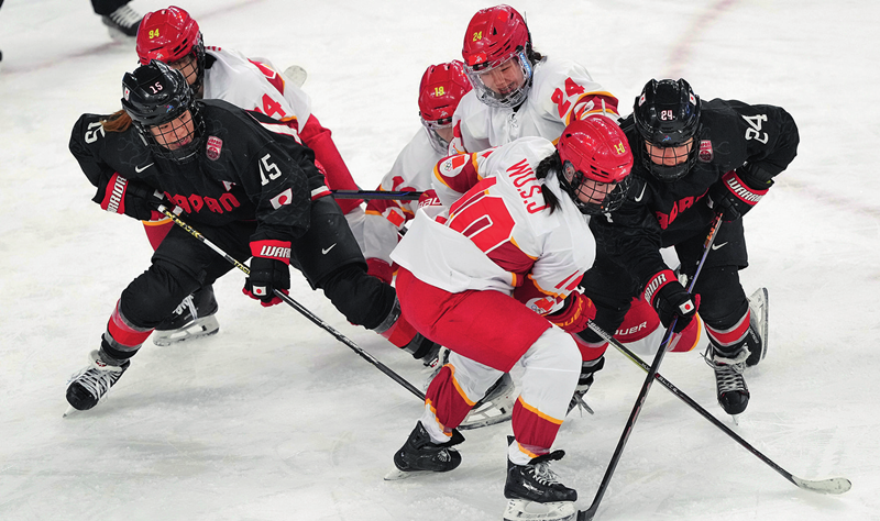 中国队球员吴思嘉(前左)在第九届亚冬会女子冰球小组赛A组比赛中拼抢(2025年2月14日摄)颜麟蕴摄/瞭望