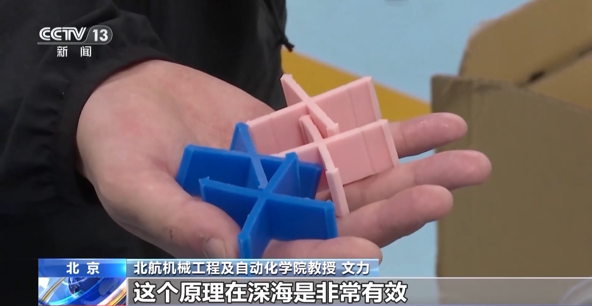 北航机械工程及自动化学院教授 文力:我们巧妙地利用了一种叫手性双稳态结构,就像我们平常可能玩过的一些玩具,它是从一边的凸起稍稍给力,就会突跳到另外一边,这个原理在深海非常有效。其原因在于深海的压力会把这个软软的、突跳的东西压得更硬。
