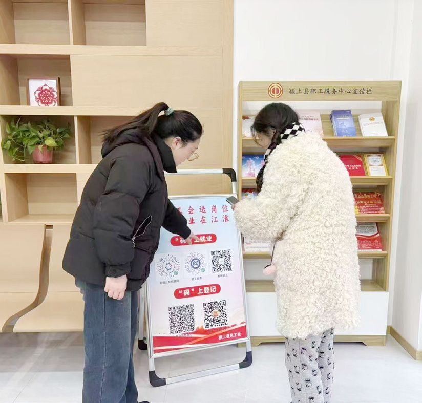 长期以来,求职者在求职过程中常常面临信息获取不及时、休息场所不足等问题。颍上县总工会敏锐捕捉到这些痛点,充分发挥工会驿站作用,与人力资源市场深度融合,为求职者提供全方位、一站式服务。县总工会在工会驿站张贴“码”上就业和“码”上登记二维码,求职者拿出手机扫描二维码便可轻松获取最新招聘信息。同时,工会驿站里还设有专门的就业服务咨询台,工作人员随时为求职者解答就业政策、岗位信息、职业规划等方面的疑问,帮助他们更好地了解就业形势和市场需求。