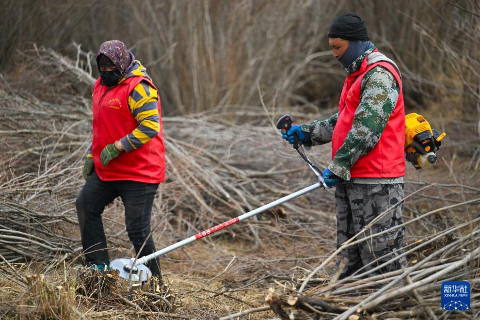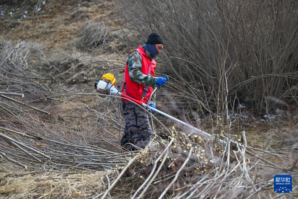 3月25日,锡林郭勒盟正镶白旗的农牧民用割灌机给红柳平茬。新华社记者 彭源 摄