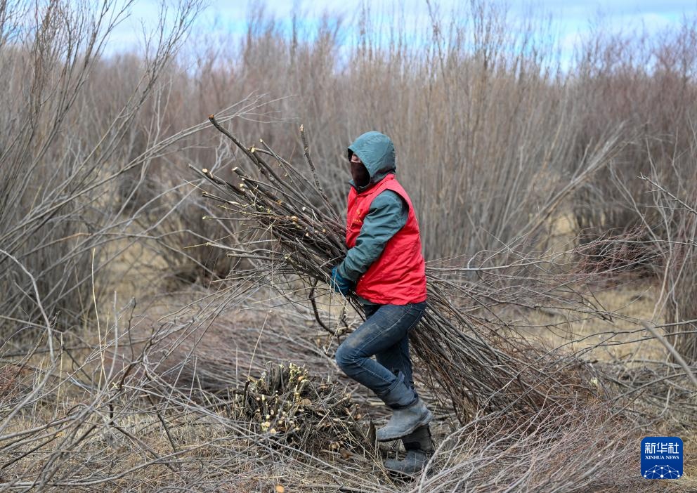 3月25日,锡林郭勒盟正镶白旗的农牧民搬运红柳条。新华社记者 彭源 摄