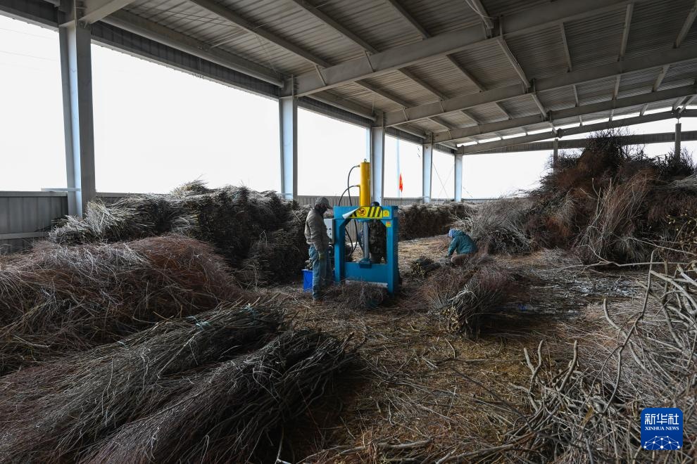 3月25日,锡林郭勒盟正镶白旗的农牧民操作机器切割红柳条。新华社记者 彭源 摄