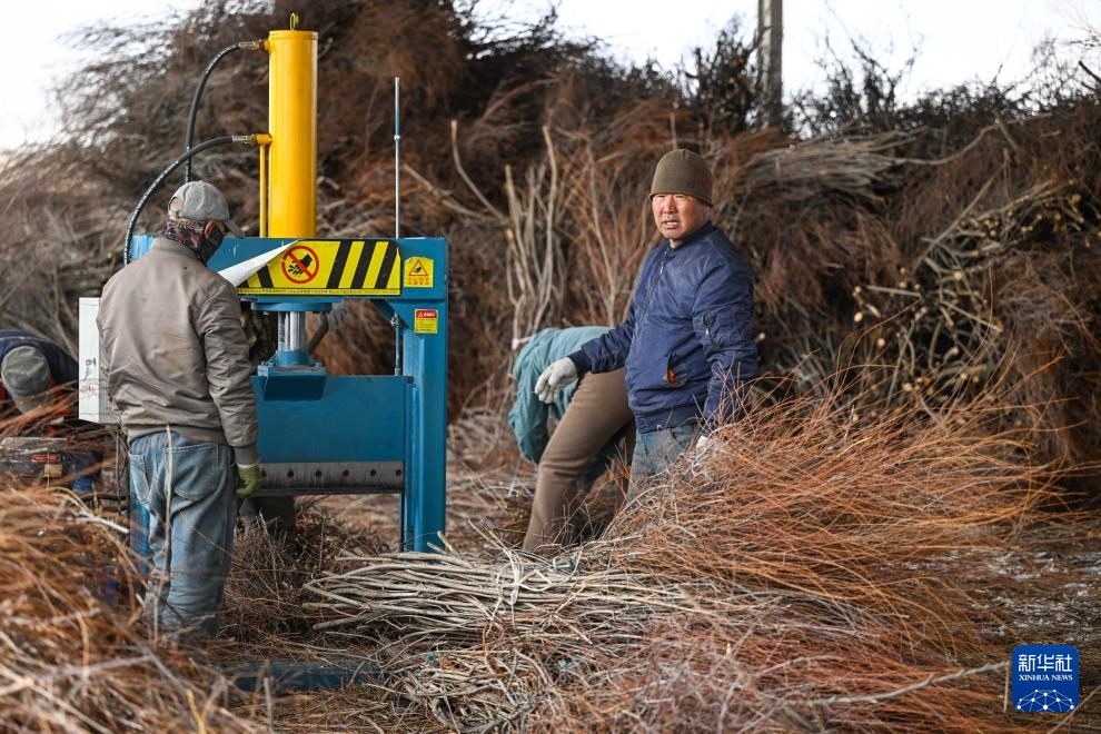 3月25日,锡林郭勒盟正镶白旗的农牧民在切割红柳条。新华社记者 彭源 摄