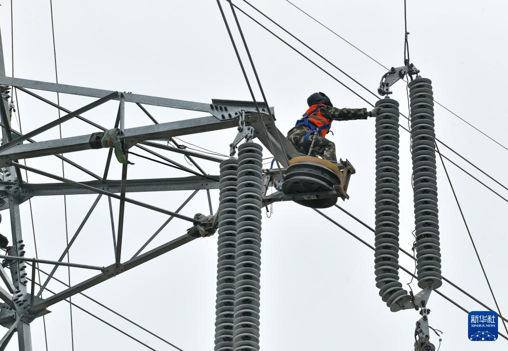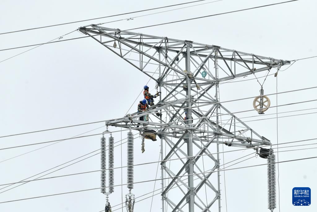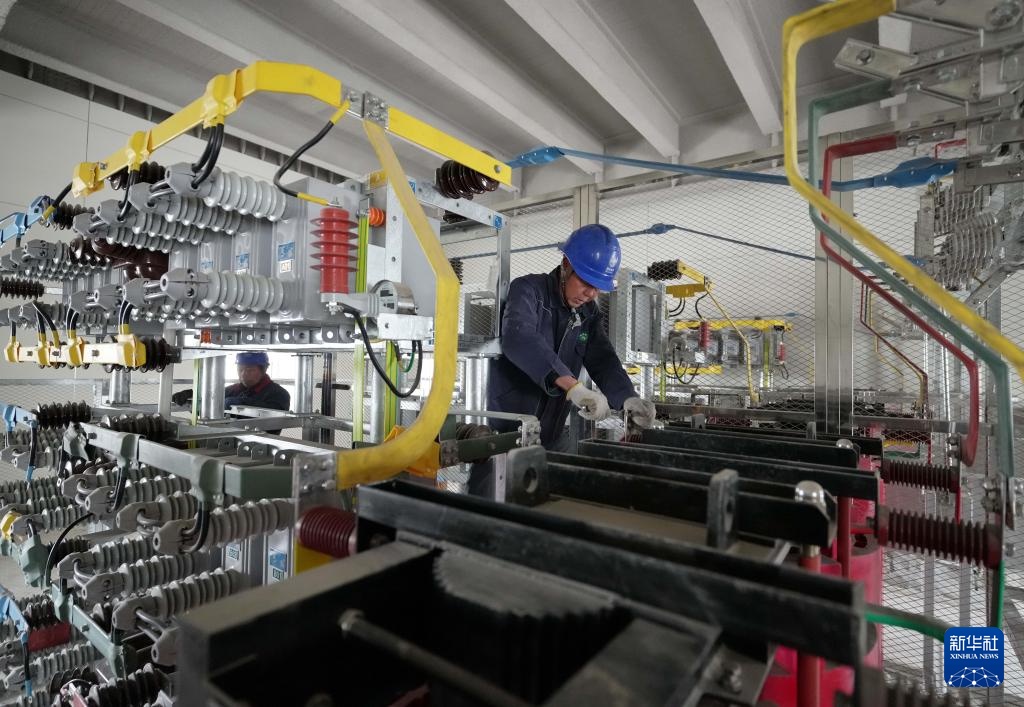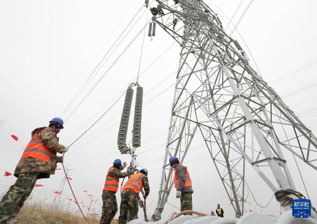 3月27日,国网沧州供电公司的工人在大白冢220千伏输变电工程建设工地施工。新华社记者 杨世尧 摄