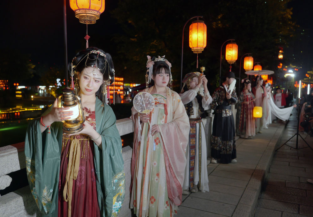 2023年10月24日,游客在洛阳市洛邑古城身着汉服拍照留念。